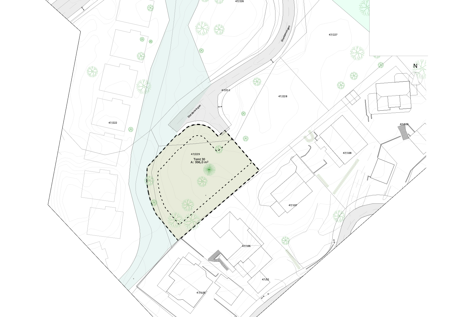 Det er ingen byggeklausul for Norgeshus men vi kan bistå med hjelp fra Norgeshus sine dyktige arkitekter. Det er laget en skisse som viser mulighet tomten har for en spesiell bolig, denne boligen er ikke kostnadsberegnet. Fasadetegninger og plantegning av skissert bolig kan sees i bildevisningen under.